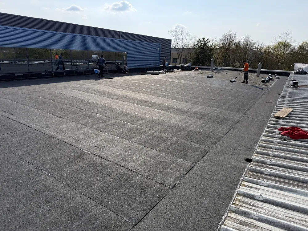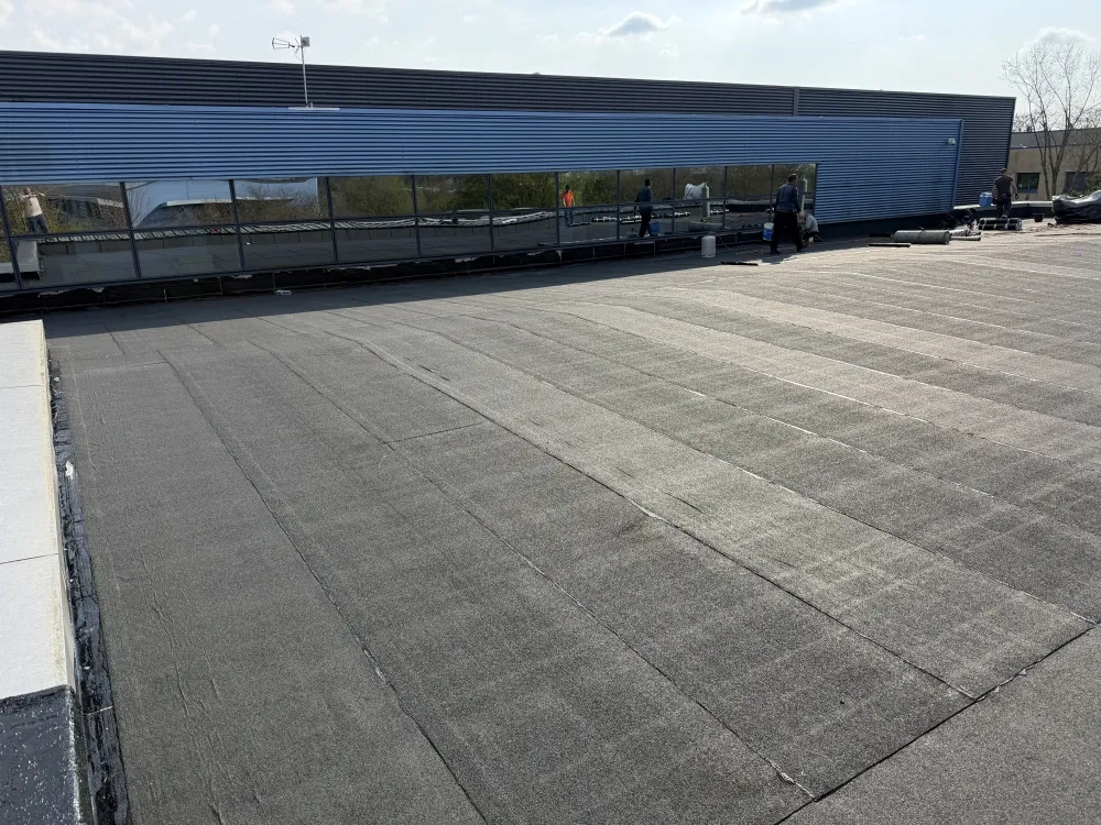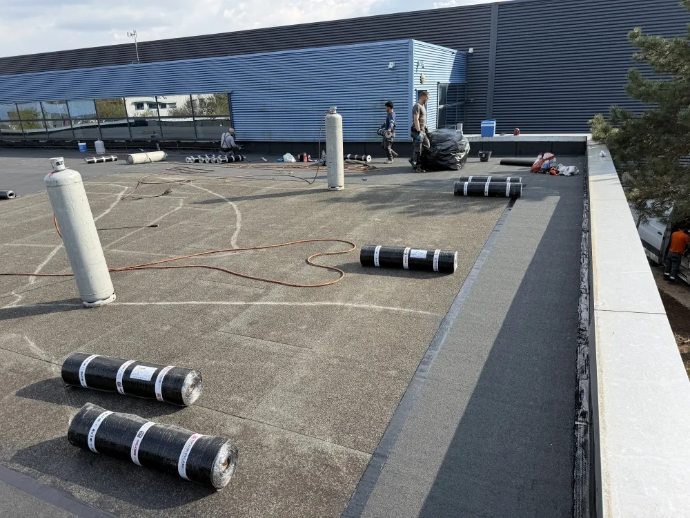 Mise en place d'une couche supplémentaire bitumineuse sur toiture.